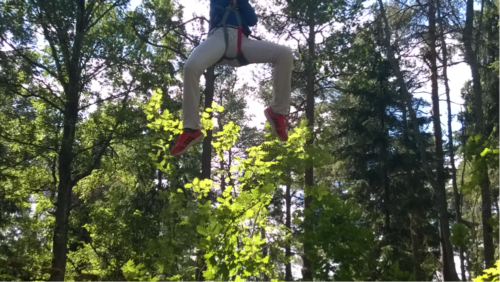 Kiipeilypuisto on hyvä paikka testata omaa kuntoaan ja korkeanpaikankammoaan. Kun kaikki tapahtuu kymmenen metrin korkeudessa, mäntyjen latvojen korkeudella, syke hakkaa ja jännitys vie vallan. Täältä ei voi pudota, sen verran hyvin valjailla köytettyjä olemme, mutta adrenaliini virtaa ja saa haluamaan lisää.