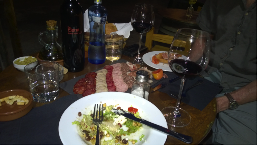 Pitkän päivän päätteeksi maistui kevyt tapas-pöytä paikallisessa pikkukuppilassa. Ja tietysti paikallista viiniä, suoraan naapurista Parés Baltàlta. Sekin hyvä puoli pyöräreissussa on, että ruoasta voi nauttia täysin siemauksin, kun kulutuskin on normaalia suurempi.