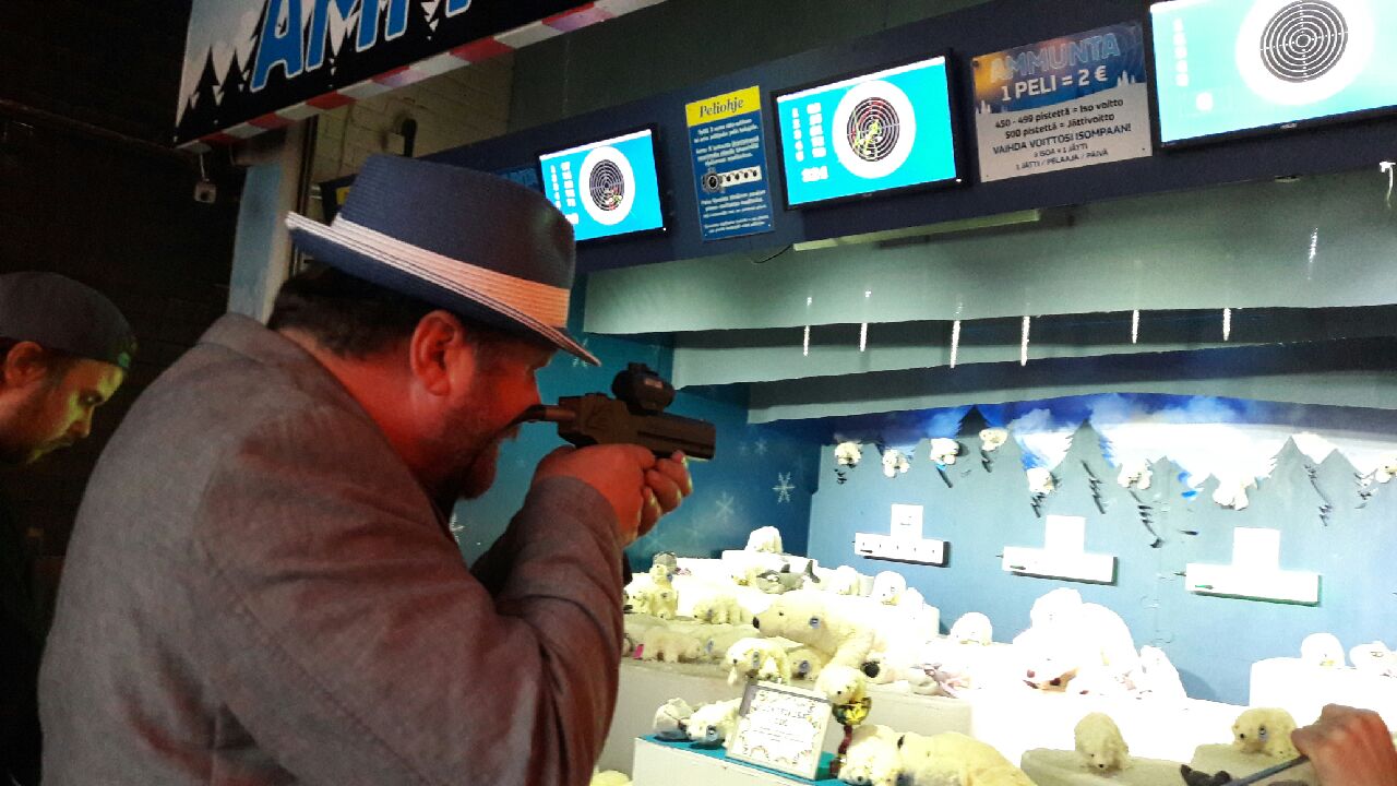 Hän lupasi siis pehmolelun. Hän aikoi ampua sen minulle. Jokin elokuva oli nähtävästi juuri katsottu. Hän osui, mutta ei riittävän tarkasti.
