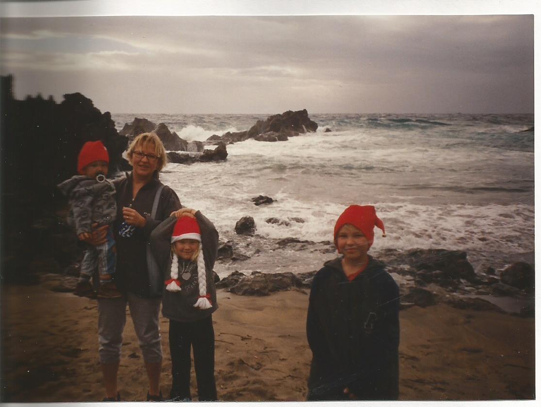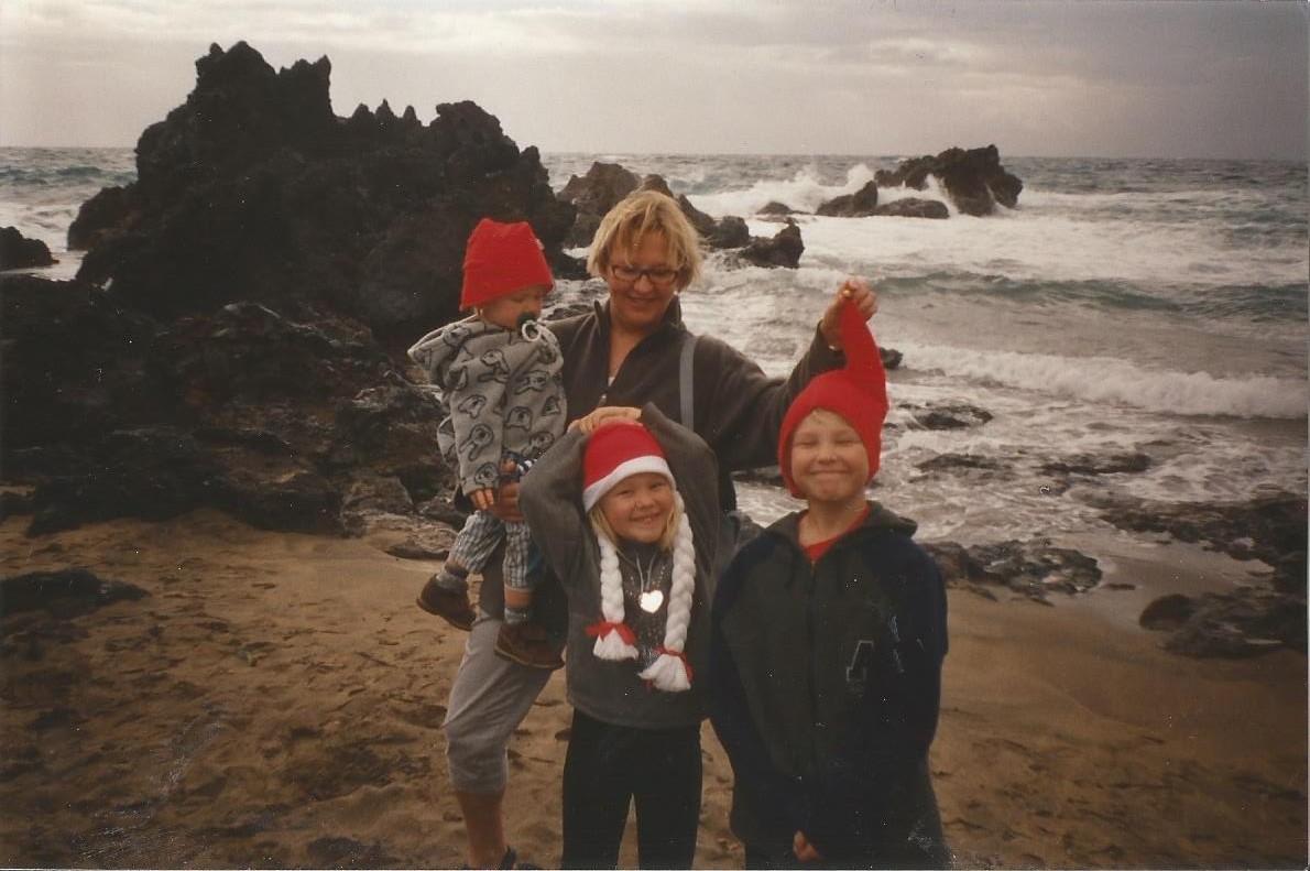 Ensimmäinen päivä pääkaupunki Puerto del Carmenissa oli ihana! Aurinko paistoi täysillä. Lapset touhusivat mustahiekkaisella rannalla. Aioimme ottaa ”huomenna” joulukorttikuvat biitsiltä tonttulakit päässä. Nekin olimme raahanneet varmuuden vuoksi mukaan.